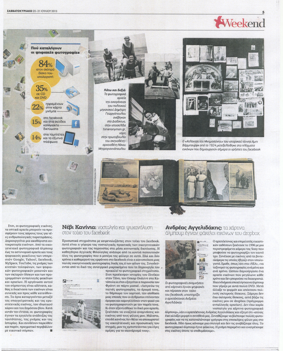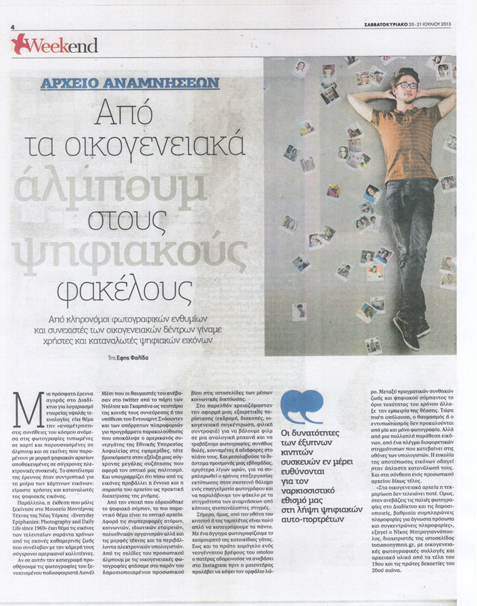 Δημοσιεύτηκε στα Νέα του προηγούμενου Σαββατοκύριακου (20-21 Ιουλίου 2013) το άρθρο της Έφης Φαλίδα "Αρχείο Αναμνήσεων-Από τα οικογενειακά άλμπουμ στους ψηφιακούς φακέλους". Στο άρθρο πραγματοποιείται μια ενδιαφέρουσα σύγκριση ανάμεσα στην τυπωμένη και την ψηφιακή φωτογραφία και στο πώς η μετάβαση από τη μία μορφή απεικόνισης στην άλλη μετέβαλε τη στάση μας απέναντι στα οικογενειακά αρχεία, ενώ γίνεται ιδιαίτερη αναφορά στο οπτικοακουστικό αρχείο "Των Ανωνύμων".