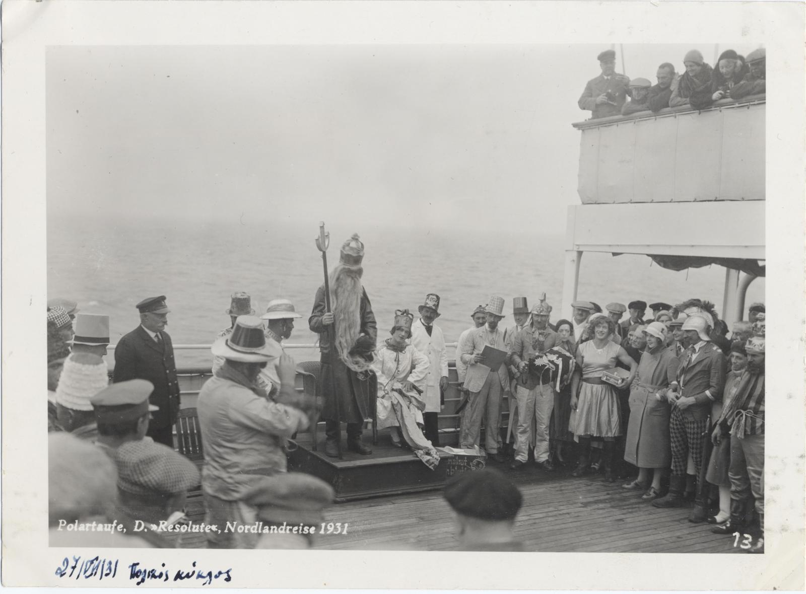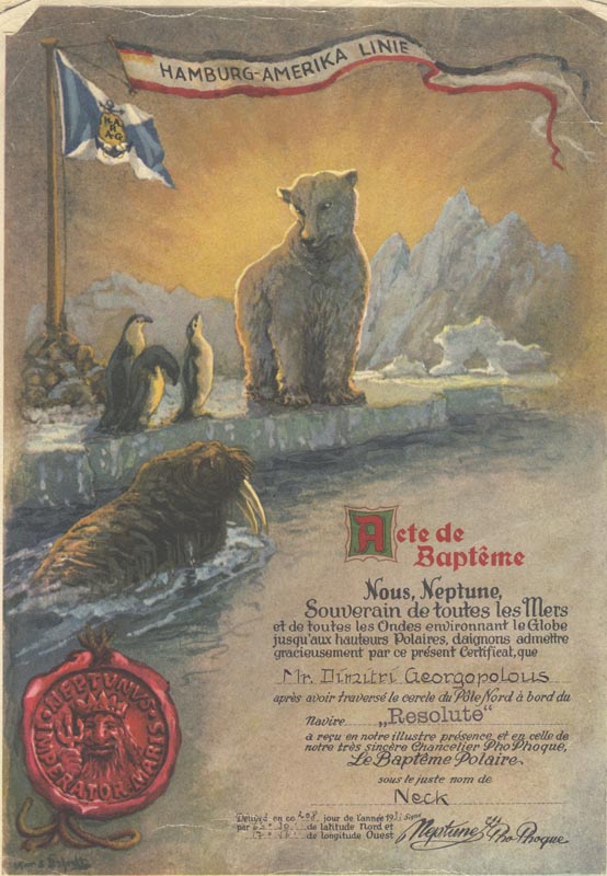 Τον Ιούλιο του 1931, δυο νεόνυμφοι από την Ελλάδα, ο Δημήτρης και η Αγλαϊα Γεωργοπούλου, αποφασίζουν να περάσουν τον μήνα του μέλιτος ταξιδεύοντας προς τον Βόρειο Πόλο. Από εκείνη την περιπέτεια παρουσιάζουμε σήμερα το πιστοποιητικό που έδινε ο καπετάνιος του πλοίου σε όλους τους επιβαίνοντες μόλις έφταναν στον πολικό κύκλο. Ουσιαστικά επρόκειτο για μία βάπτιση στην οποία οι ταξιδιώτες έπαιρναν ένα νέο όνομα-το "Neck" στην περίπτωση του Δημήτρη Γεωργόπουλου. Το πλοίο με το οποίο έγινε το ταξίδι λεγόταν Resolute. Η ασπρόμαυρη φωτογραφία πρέπει να είναι στιγμιότυπο από την τελετή της βάπτισης-μετονομασίας, με τον καπετάνιο του πλοίου να υποδύεται - μάλλον-τον Ποσειδώνα.