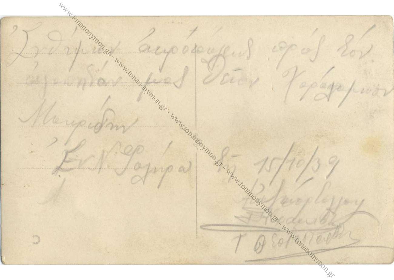 Ορφανή φωτογραφία πίσω όψη στην πίσω πλευρά αναγράφεται: "Ενθύμιον Ακροπόλεως προς τον αγαπητόν μας θείον Χαράλαμπον Μαυρίδην Εν Ν. Φαλήρω τη 15/10/39 [...] "Εντοπίστηκε το 2016 σε παλαιοπωλείο στη Θεσσαλονίκη Κωδικός ορφανά RPH-0021