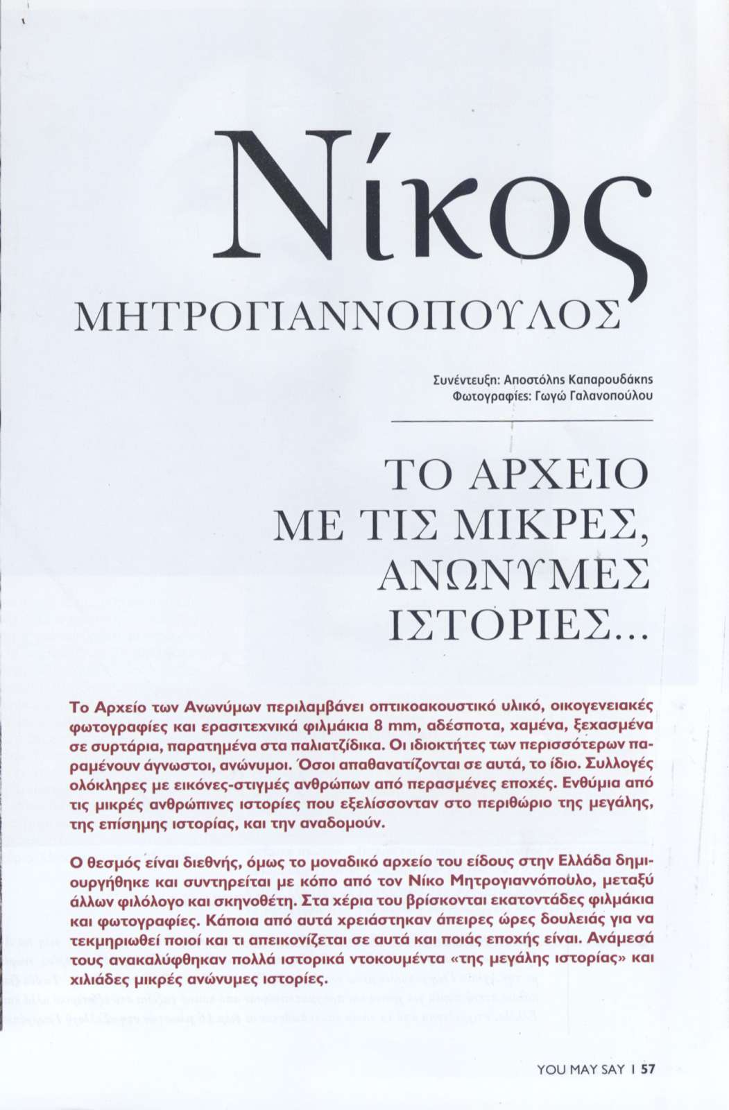 Συνέντευξη του Νίκου Μητρογιαννόπουλου στο τελευταίο τεύχος του περιοδικού "You may say". Όλα όσα θα θέλατε να μάθετε για το αρχείο "των Ανωνύμων" και δεν τολμούσατε να ρωτήσετε. Ευχαριστούμε τους συντελεστές του περιοδικού και ειδικά τον Αποστόλη Καπαρουδάκη. Το τεύχος θα το βρείτε σε όλα τα καλά ενημερωμένα βιβλιοπωλεία. Και αλλού προφανώς. Συνεχίζουμε και το καλοκαίρι, σε πείσμα της πανδημίας. Μείνετε