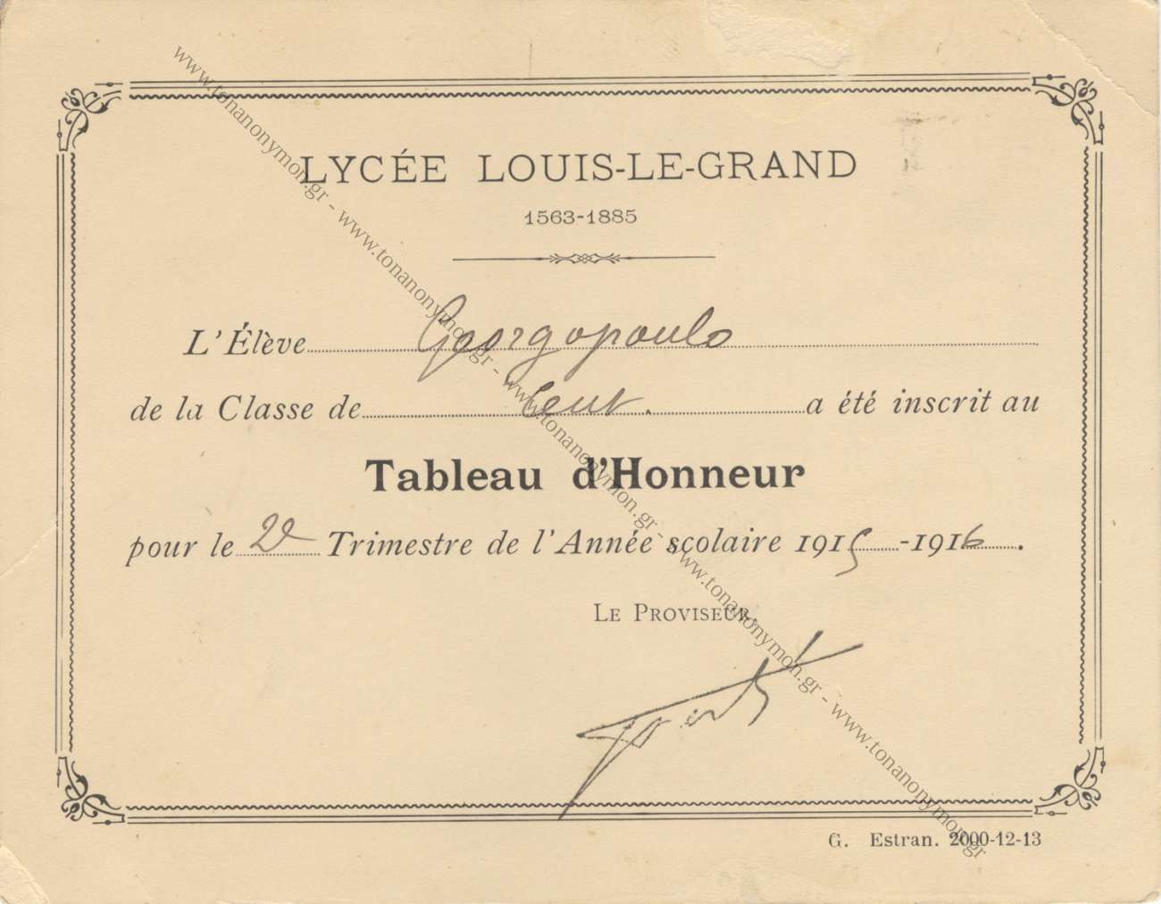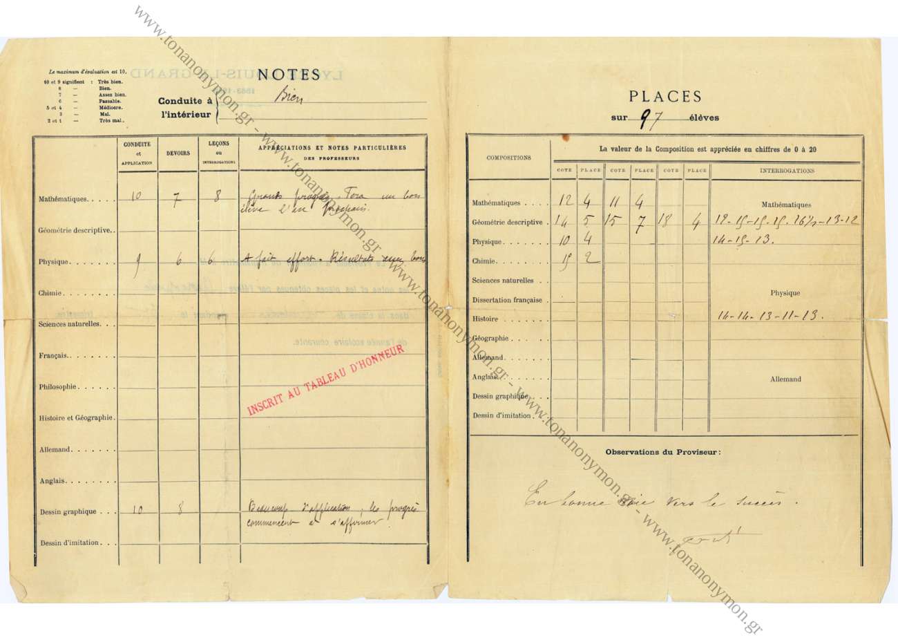 TABLEAU D' HONNEUR
