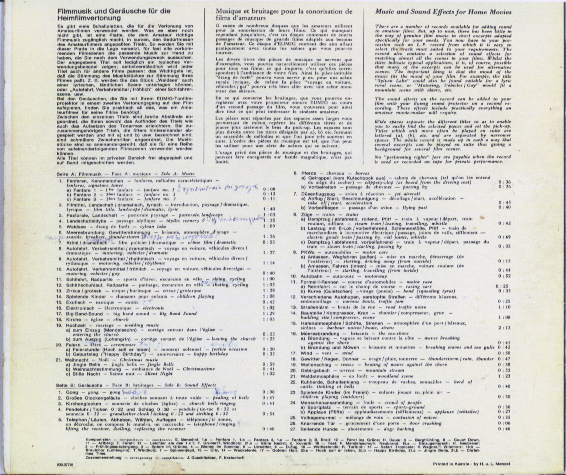 Από τις εμβληματικές εταιρίες στο χώρο του ερασιτεχνικού κινημα-τογράφου, η Eumig ιδρύθηκε το 1919 στη Βιέννη κατασκευάζοντας αρχικά αναπτήρες, θήκες για τσιγάρα και διάφορα ηλεκτρικά εξαρτήματα. Το 1924 άρχισε την παραγωγή ραδιοφώνων, ενώ το 1928 μπήκε και στο χώρο των ταινιών, κάτι που οδήγησε στο να εμφανιστεί, τρία χρόνια αργότερα, στην αγορά η πρώτη κινηματογραφική μηχανή προβολής με την επωνυμία της, η "Eumig P 1". Στη Eumig ανήκε η πρώτη ημιαυτόματη μηχανή λήψης, αλλά και πολλά μοντέλα του περίφημου "People's Radio" που διευκόλυνε αφάνταστα τη διάδοση των ναζιστικών ιδεών στη Γερμανία. Μεταξύ άλλων, η εταιρία κατά τη διάρκεια του δευτέρου παγκοσμίου πολέμου ανοίχτηκε και στο πεδίο των στρατιωτικών εξοπλισμών, με αποτέλεσμα το βομβαρδισμό του εργοστασίου της το 1945. Μετά τον πόλεμο συνέχισε την παραγωγή φωτογραφικού και κινηματογραφικού υλικού και στα τέλη της δεκαετίας του '60 αποτελούσε τη μοναδική ευρωπαϊκή εταιρία που διέθετε μια πλήρη γκάμα προϊόντων για τον ερασιτεχνικό κινηματογράφο. Ανάμεσα σε αυτά τα προϊόντα μας έκανε εντύπωση το ότι υπήρχαν και δίσκοι με ηχητικά εφέ (ανακαλύψαμε τουλάχιστον έναν) και μουσικά θέματα, ιδανικά για τους επίδοξους σκηνοθέτες που επιθυμούσαν να εμπλουτίσουν την ηχητική μπάντα της ταινίας τους.  Το φινάλε ωστόσο της ιστορίας της Eumig δεν ήταν ευχάριστο: το 1982 η εταιρία κήρυξε πτώχευση, ενώ το 1989 η επωνυμία της πουλήθηκε στη γερμανική Rothenberger GmbH.